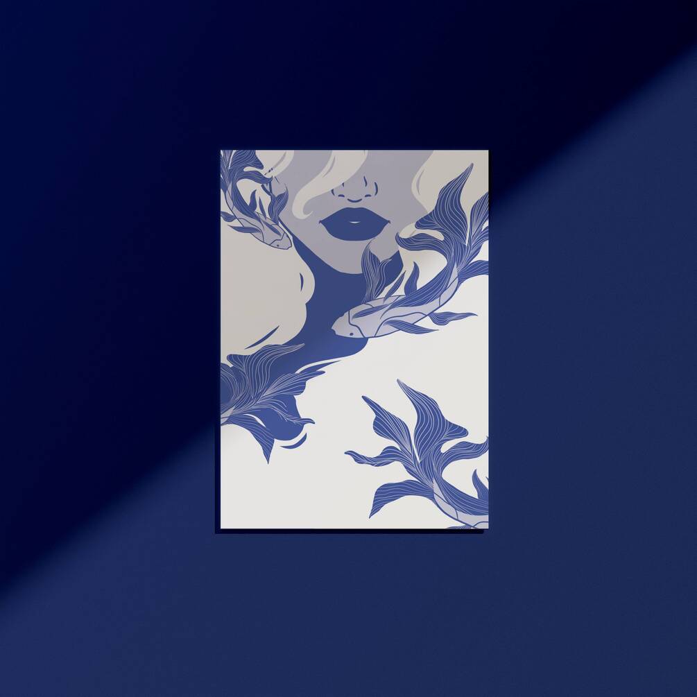 Feminine mystery meets ocean energy in this flowing portrait. Koi fish weave through blue waves and soft features, creating a meditative piece that feels both still and in motion.