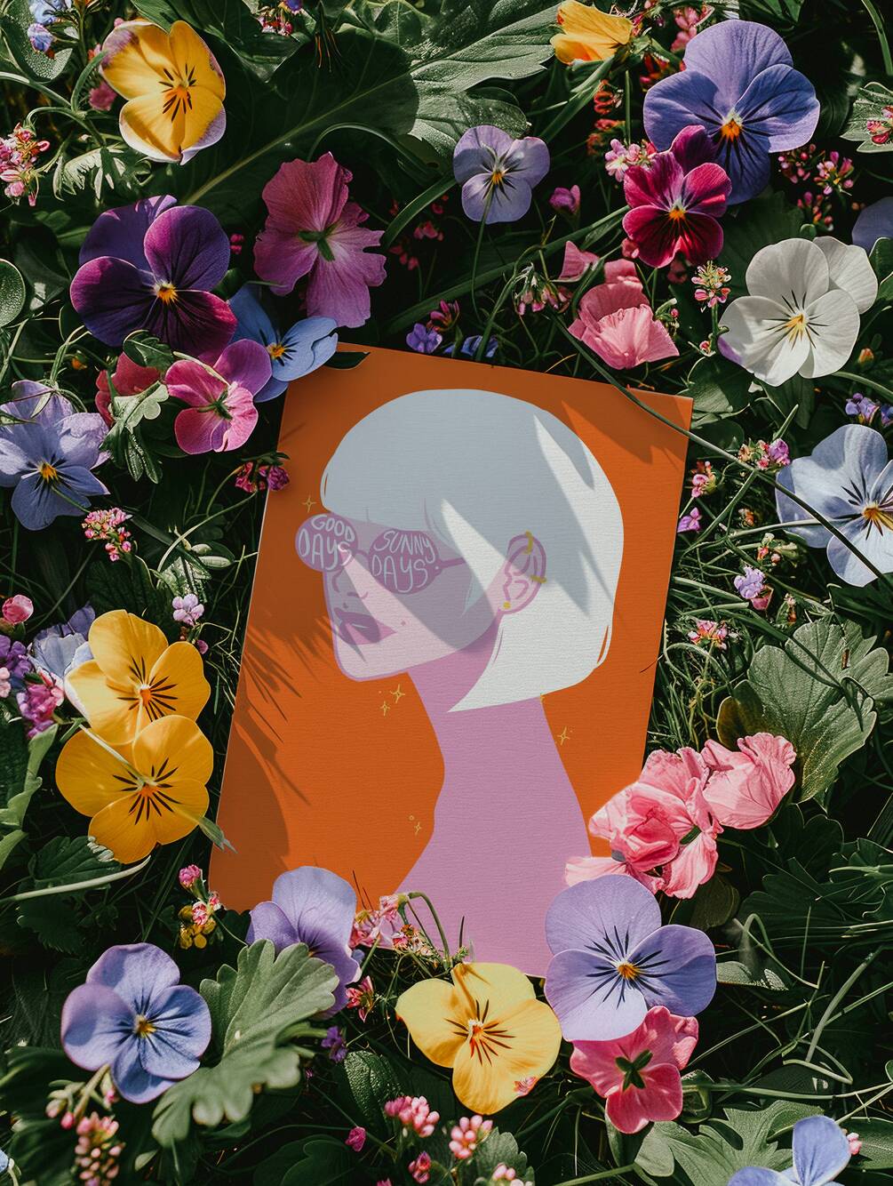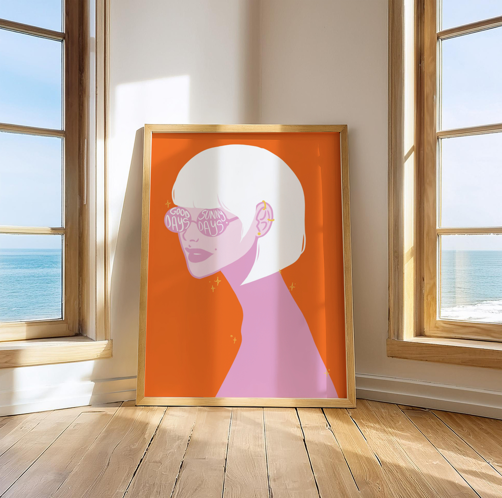 A radiant tribute to summer confidence, this bold digital print features a modern woman wearing mirrored sunglasses that beam with optimism. The vibrant orange backdrop brings warmth and boldness into any space.